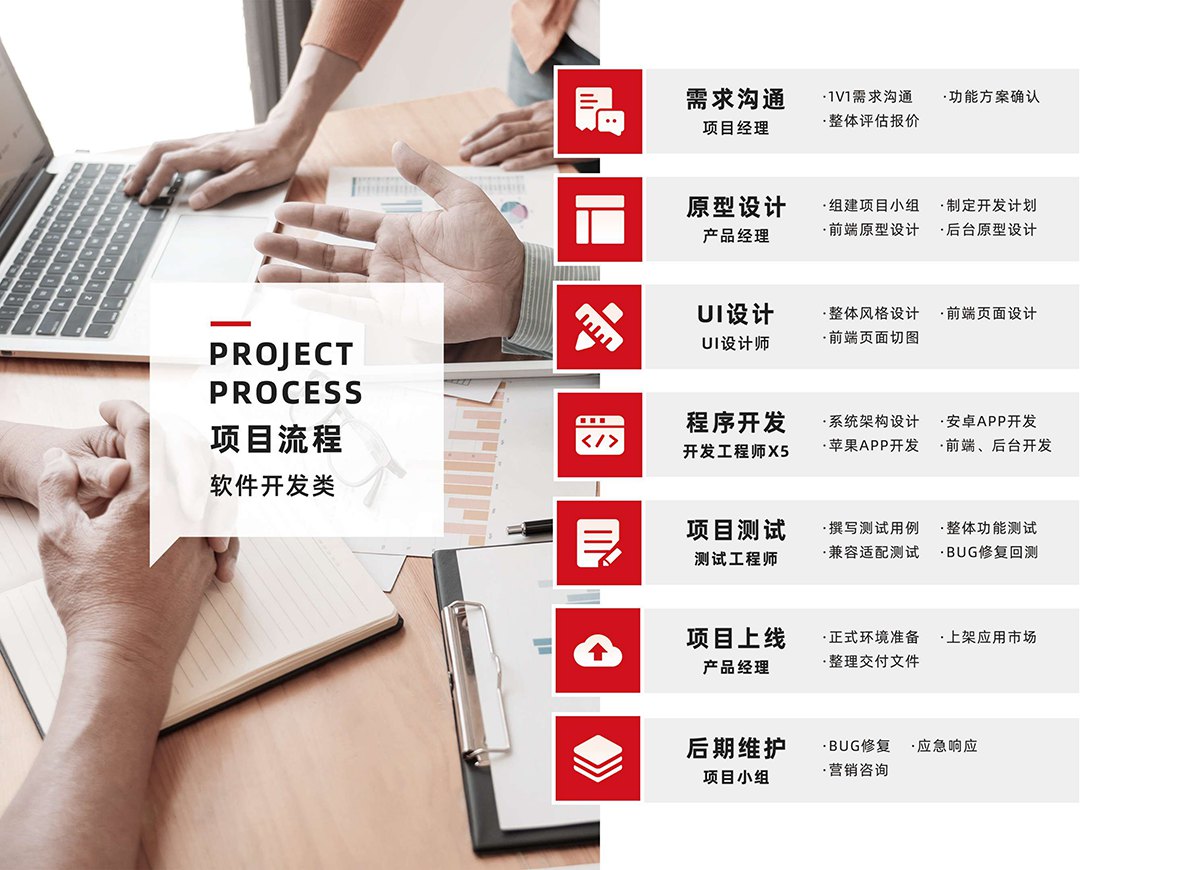 2. 全流程技术服务:提供从需求沟通、原型设计、UI设计、程序开发,到项目测试、项目上线及后期维护的全周期服务,项目分7个阶段、9个团队角色协作,严控进度与代码质量;后期还提供BUG修复、应急响应、营销咨询等持续支持。