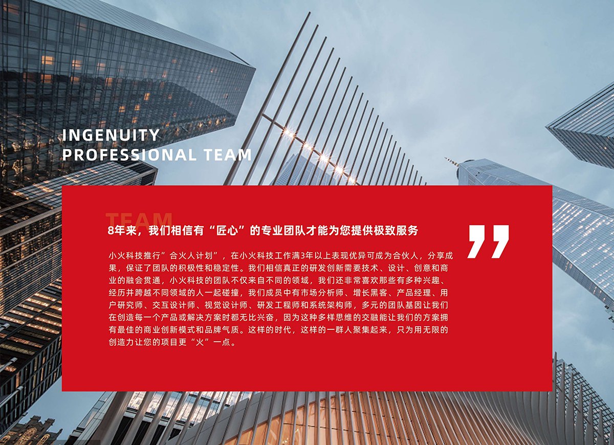 3. 团队发展理念:推行“合伙人计划”,满3年且表现优异的员工可成为合伙人,保障团队积极性与稳定性;鼓励跨领域协作,汇聚多元思维,以“匠心”打造极致服务,推动企业、员工与客户共同成长。