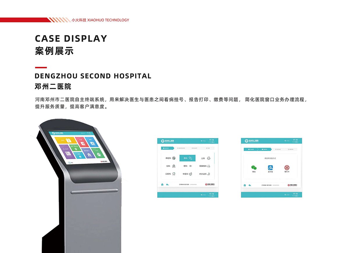 24. 邓州二医院:打造自主终端系统,解决医患挂号、报告打印、缴费等核心业务痛点,简化窗口办理流程,显著提升服务质量与患者满意度。