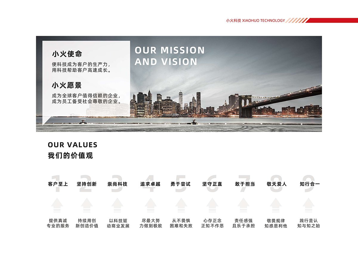 2. 企业文化与价值观:秉持“专业、诚信、务实、创新”的企业文化,坚守“客户第一、服务至上、创造价值”的服务理念;以“客户至上、坚持创新、崇尚科技、追求卓越、勇于尝试、坚守正直、敢于担当、敬天爱人、知行合一”为核心价值观,践行科技驱动商业发展的理念。