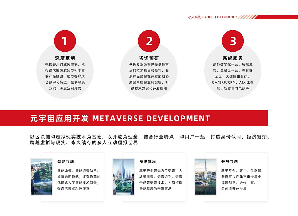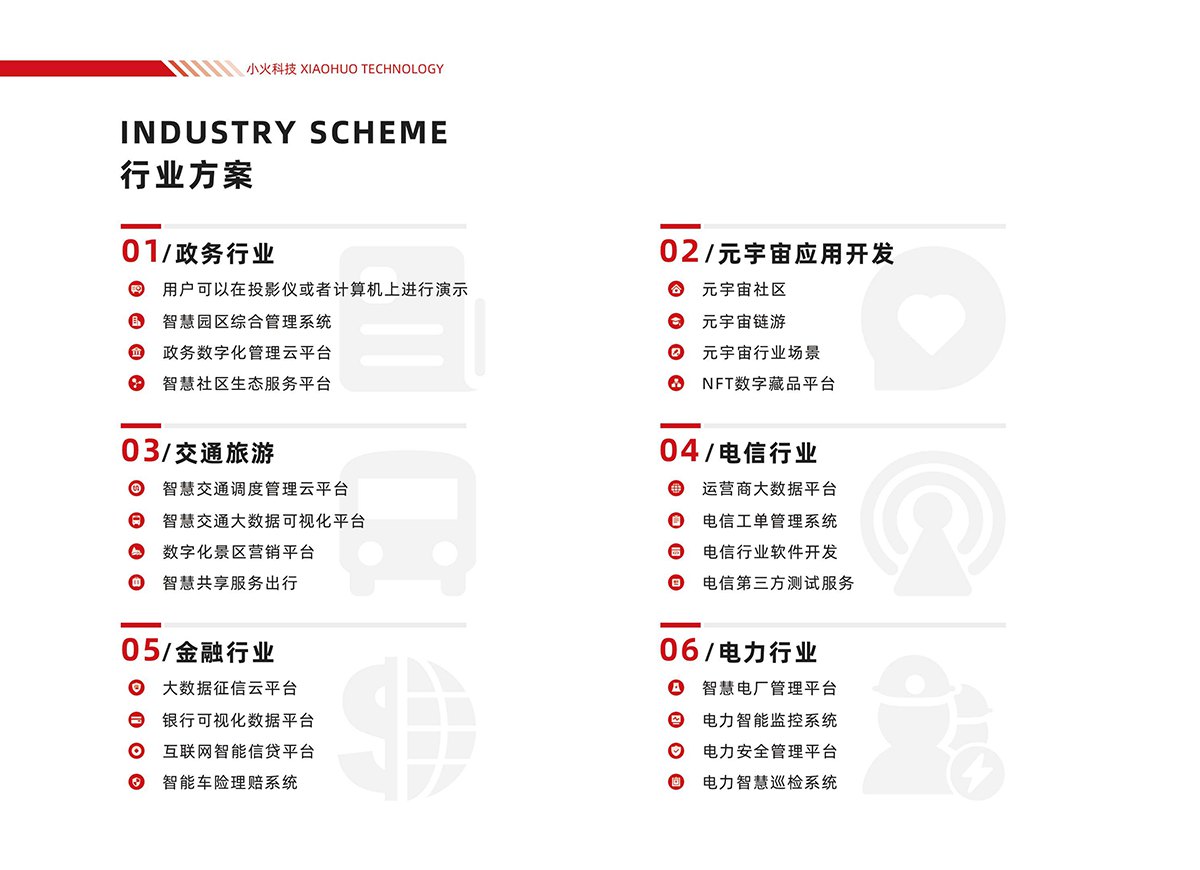 小火科技以技术赋能多行业发展,为政府、教育、医疗、能源、制造、交通、电信等行业提供数字化解决方案,同时深耕元宇宙、大数据等前沿领域,打造智能互动、身临其境、开放共创的元宇宙应用场景,以技术创新践行社会责任,助力行业数字化升级与商业价值提升。