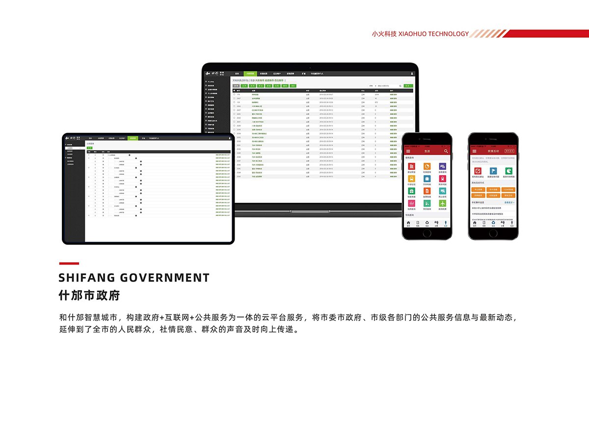 政务行业:智慧园区综合管理系统、政务数字化管理云平台、智慧社区生态服务平台、和什邡智慧城市一体化管理平台、泉通智慧园区APP等。
